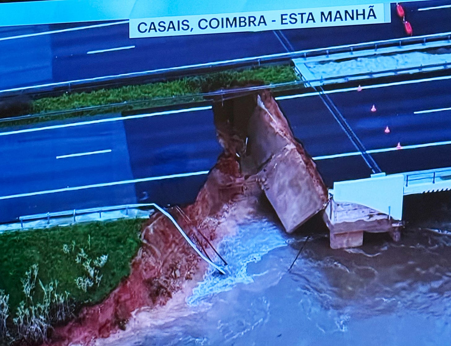 The A1, the principal motorway in the country, between Lisboa and Porto, has a 3 metre gap in it at one end of a bridge crossing the Mondego at Coimbra because of the flooding… and because, as one can see from the footage, it looks like a sand sandwich, with tarmac on top and a laje/slab of concrete beneath… not even a metre thick, laid over what used to be earth, but is now river, and not a rod of steel in sight.