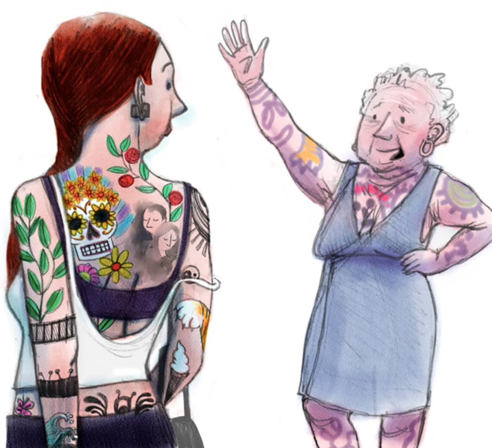 I wrote it after another day on the internet seeing all the crap, including a horrible little reel on facebook or insta or somewhere, one of those reaction videos (ugh). There was a gender reveal event (ugh) being reacted to, and standing in front of whatever was going to turn blue or pink were a young man and an old lady, white-grey curly hair, cardiganed, short.
